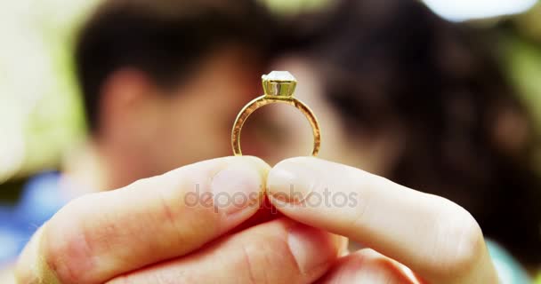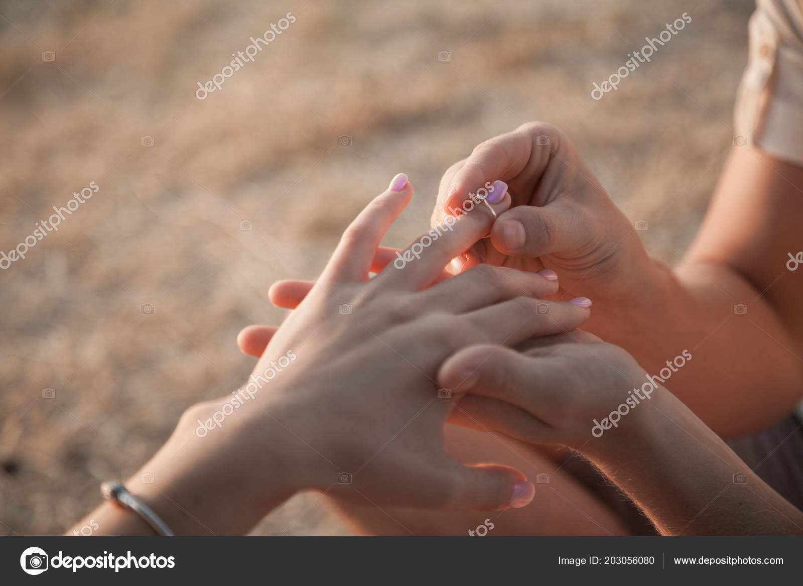 Romantic Couple Wearing Engagement Ring His Stock Photo