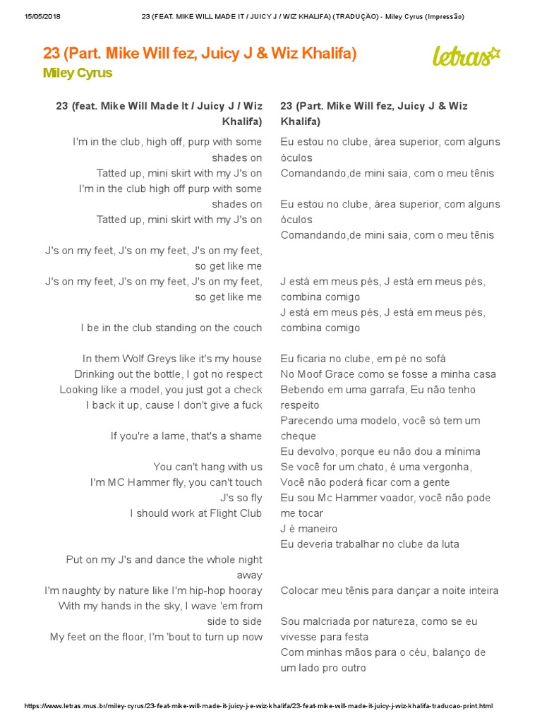 Letra 23 Ft Juicy J Miley Cyrus Wiz Khalifa Mike Will Made It