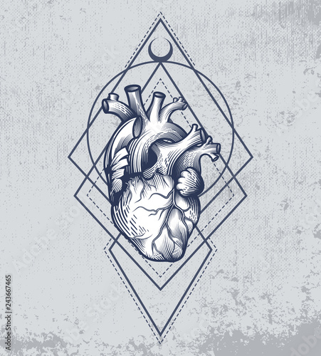 Human Heart In Engraving Technique With Sacred Geometry On