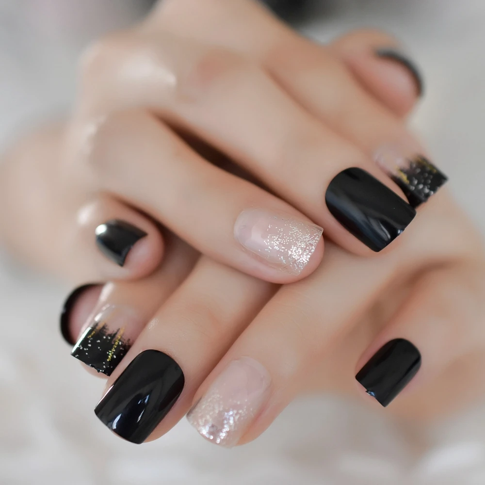 24pcs Square Black Press On Manicure Glitter Medium Acrylic Design